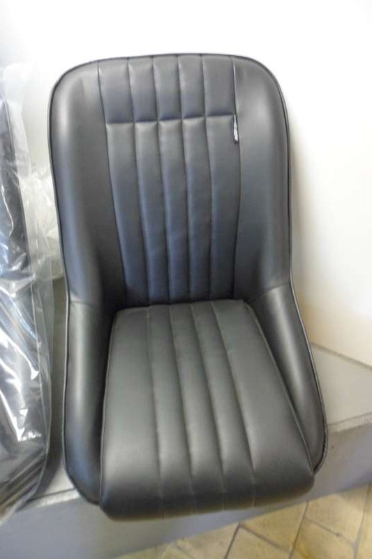 Sportstoelen classic/retro look met vaste rugleuning, niet verstelbaar. Zwarte skai. Breedte vooraan zitting: 50 cm. Breedte achteraan zitting binnenmaat: 33 cm. Breedte rugleuning bovenaan: 47 cm. Diepte zitting buitenmaat 48 cm en hoogte rugleuning 60 cm. Inclusief universele rails. Set van 2 zetels (uitverkocht maar komen terug binnen)